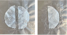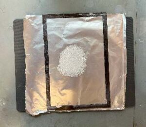 Weigh out and evenly place the material to be formed in a small circle/oval in the center of die on the nonstick foil. In this experiment 20 g of material was used for each film, but this can be tailored as needed. The butyl will need to be cut into small chunks no more than 1 cm tall. The flatter the foil and more even the pile the less wrinkles will be transferred to the final film! -