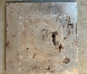 Place a thin sheet die on top of the coated foil. This will house the material preventing spill out and working to set the film thickness. Thinner dies will have a more difficult time controlling the overall thickness. For this experiment a ~0.40 mm sheet steel that was cut into a hollow frame was used. -